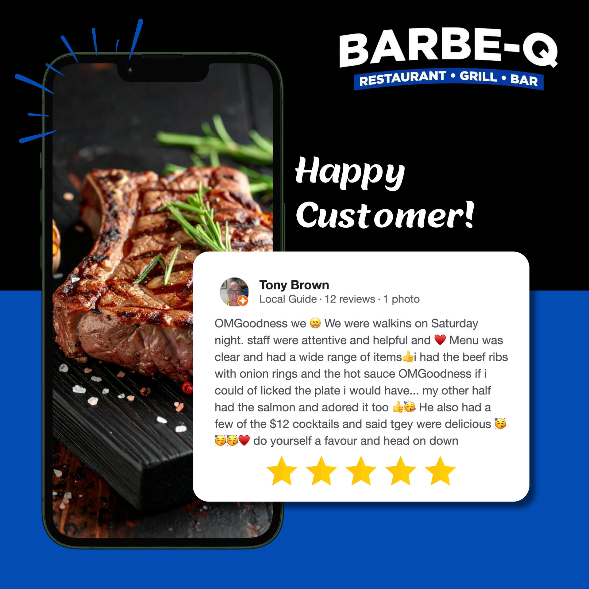 We would greatly appreciate your feedback on your dining experience at Barbe-Q Restaurant today.Please rate it on a scale of 1 to 5, with 5 representing the highest level of satisfaction.